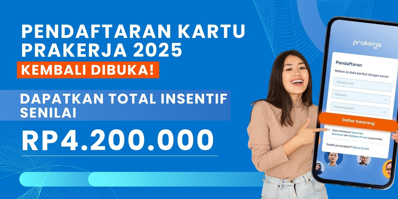 Kartu Prakerja adalah program resmi Pemerintah Republik Indonesia untuk meningkatkan kompetensi kerja masyarakat. Ikuti pelatihan dari lembaga terpercaya dan dapatkan insentif hingga Rp4.200.000. Insentif dapat dicairkan ke rekening bank atau e-wallet (OVO, DANA, GoPay, LinkAja).